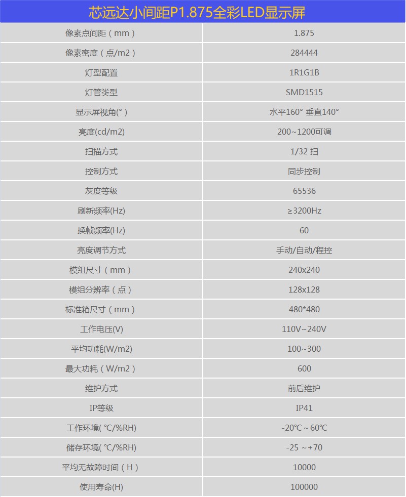模块化设计,安装及维护成本低、速度快;专利散热技术,无风扇、无噪音、节能环保;压铸铝箱体,确保屏体平整无缝,点距一致。画面均匀一致,采用非线性逐点校正技术,图像更清晰,层次感更强。